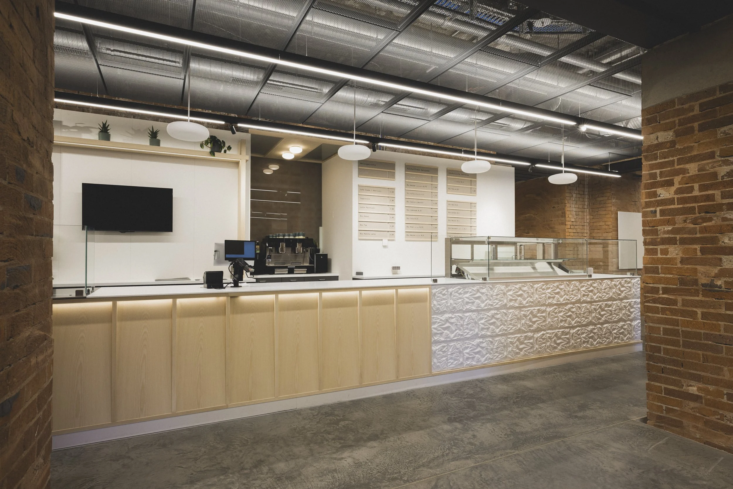 gemeinsam mit sadna haben wir den ausbau des cafe arthur im dokumentationszentrum in nürnberg ausgeführt. thekenbau in esche massiv und esche furniert mit integrierte beleuchtung